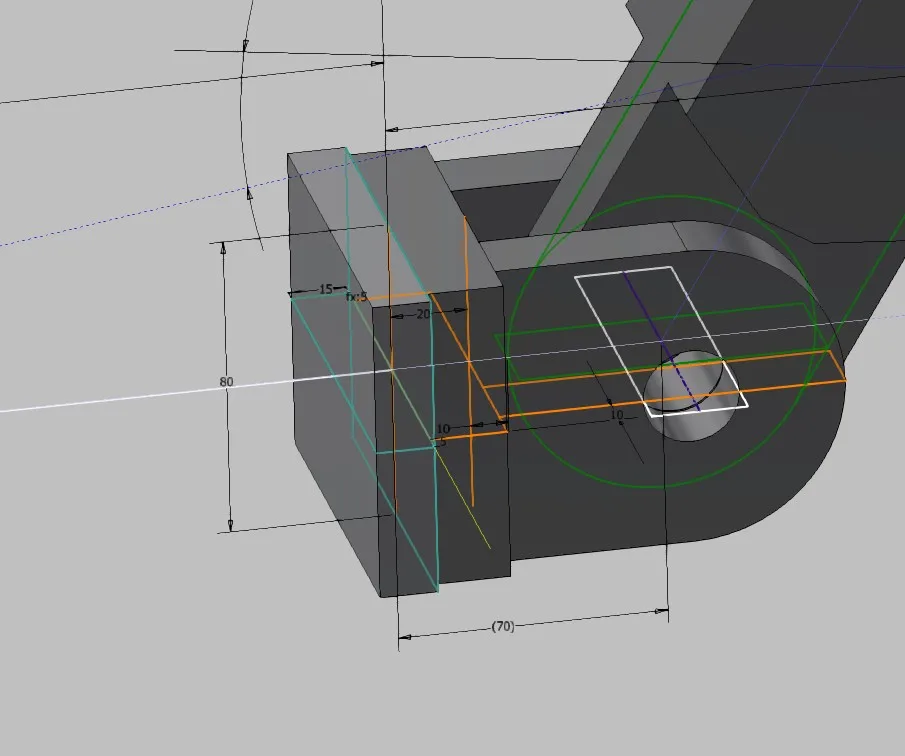 The same procedure is applied in the console of the arm (Figure 1.9). Here, too, the top view is sufficient, but this time the thread circle is used instead of the through hole circle. Again, named reference dimensions are created for increments and lengths. To automate the thread, a UDF that references the thread circle and then sets its diameter and depth via an integrated "case" block is recommended in Creo. In Inventor it is a bit more complicated, here you need an iLogic script that is either kept externally or added to each model. My external script searches for dimensions whose name starts with "agt_" (automatic threads with depth) and identically named thread features to set the appropriate thread.